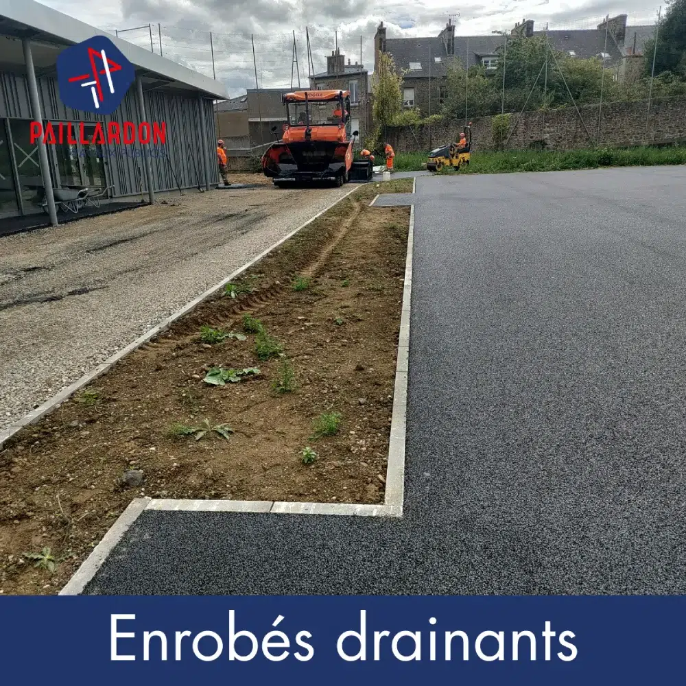 - Appliqué des enrobés drainants sur les surfaces à faibles pentes, afin d’absorber les eaux de pluie et les infiltrer directement dans le sol