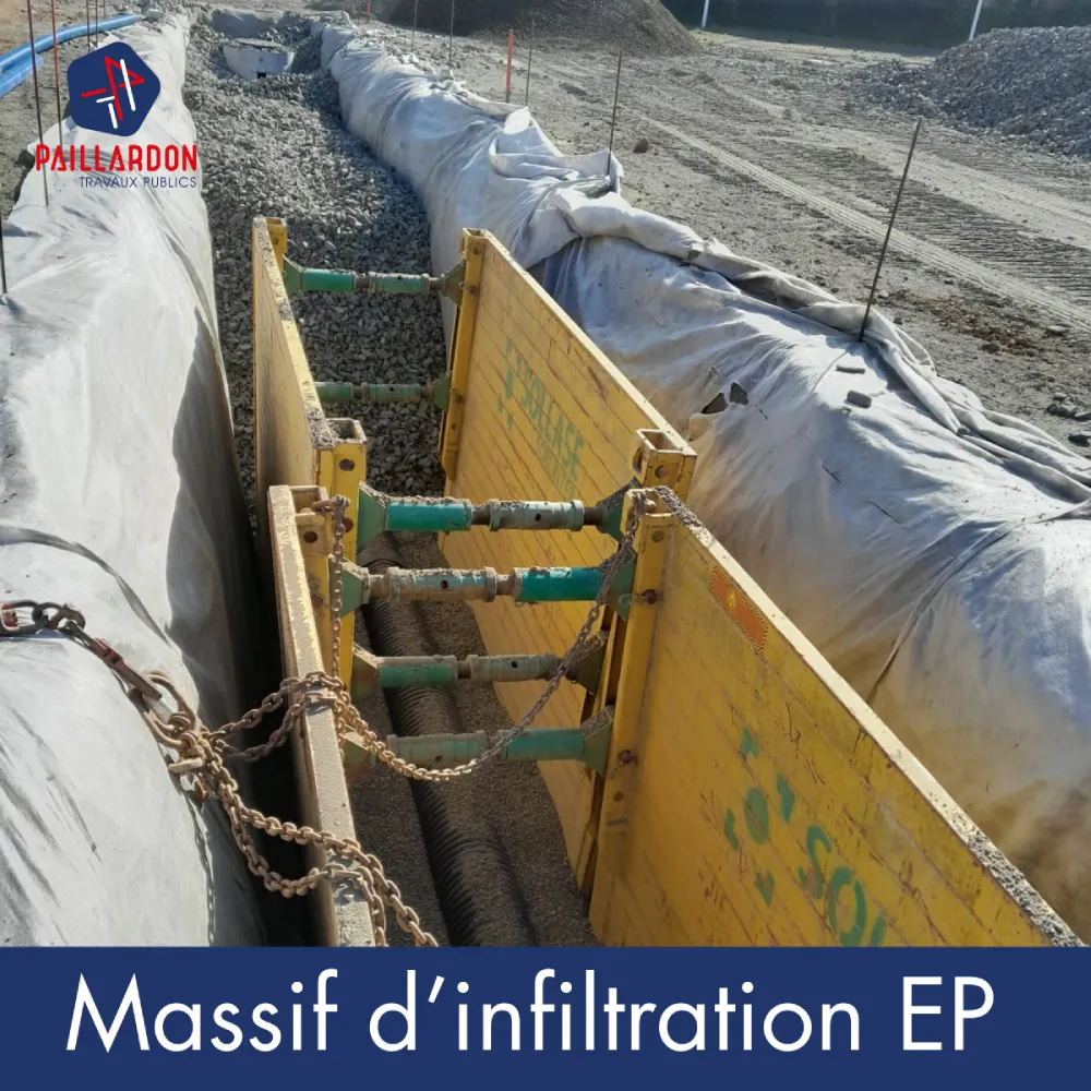 - Mis en œuvre un massif d’infiltration de 60M3 utiles pour collecter et infiltrer les eaux pluviales provenant de la toiture et des enrobés.